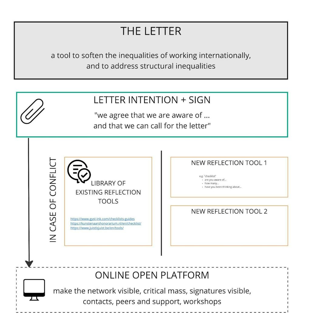 We propose an instrument that can be used to build a community of cultural workers and institutions that both discuss and tackle the inequalities within the artistic working field. We call this instrument ‘The Letter’.