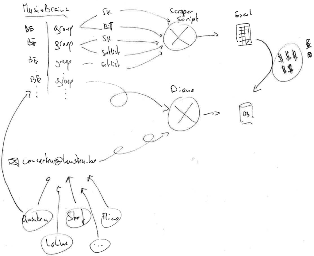 The second channel is a bit more technologically sexy, because we connect with the APIs of existing concert aggregation websites, bringing us sources such as Bands in Town, Songkick, and Setlist.fm. This channel delivers concerts from mainstream and alternative mainstream bands that have discovered these sources to reach a wider (international) audience. We keep track of these sources by using MusicBrainz.